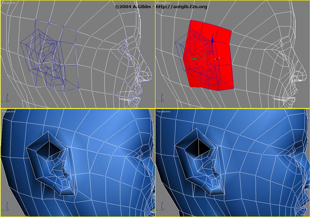 First an extra loop was placed around the eye area. The lower half of this was pushed in